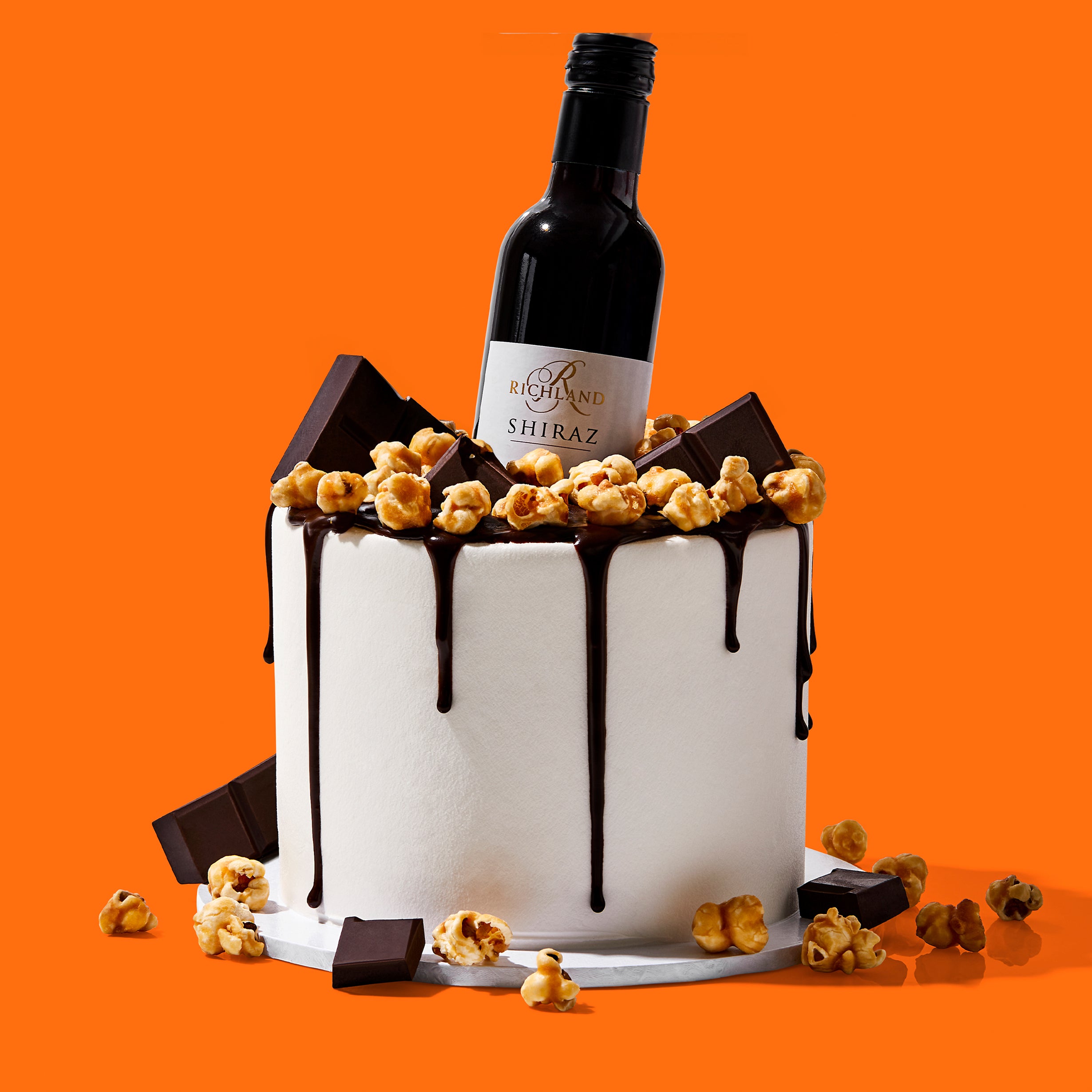 Decorations: Shiraz wine (187ml), chocolate blocks, meringue dust, caramel peanut popcorn and chocolate ganache drip