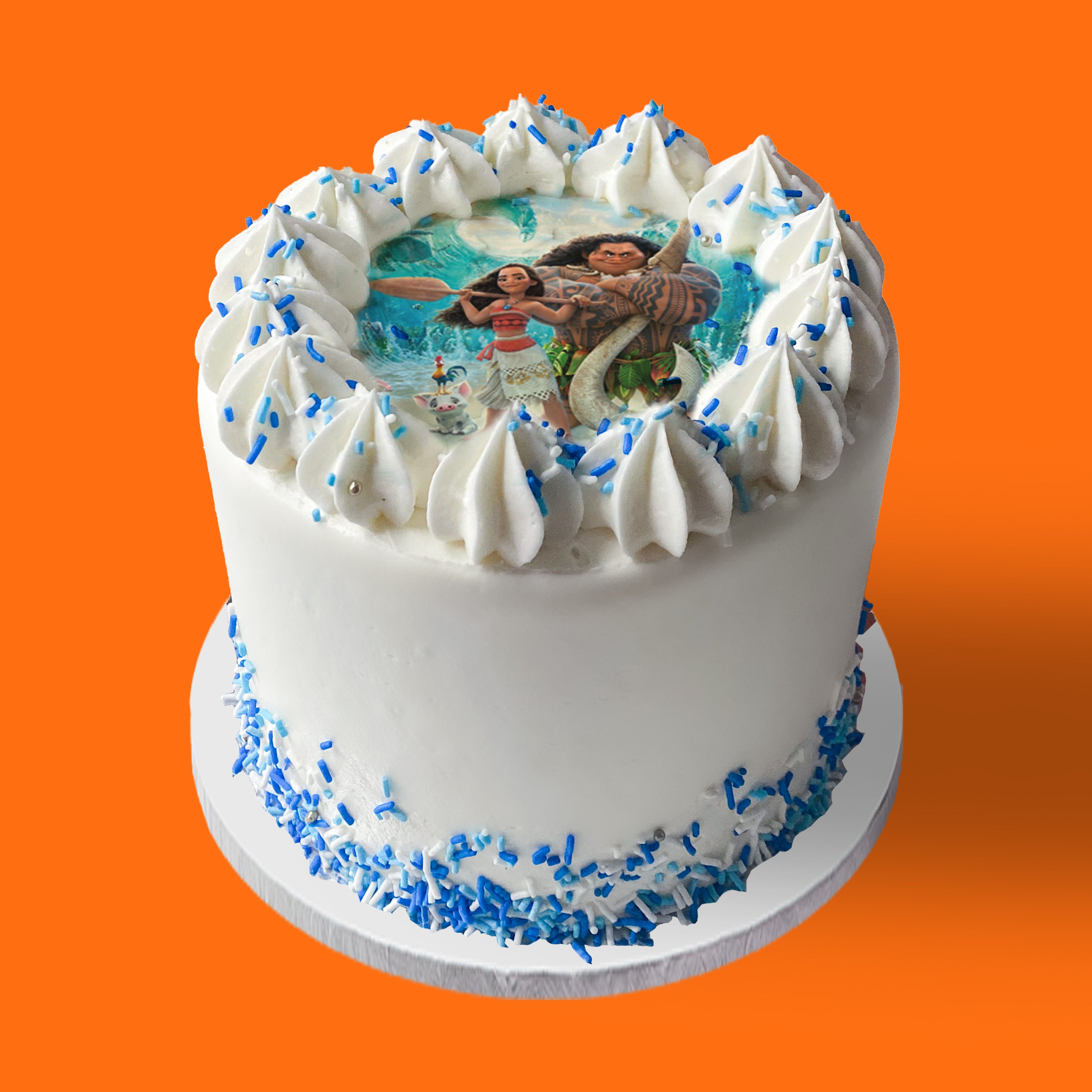 Delight your little ones with a Moana Movie Cake! With a light, fluffy chocolate sponge and rich vanilla buttercream, with a flurry of blue sprinkles, it's a fun and memorable treat! Perfect for Birthdays and sleepovers!