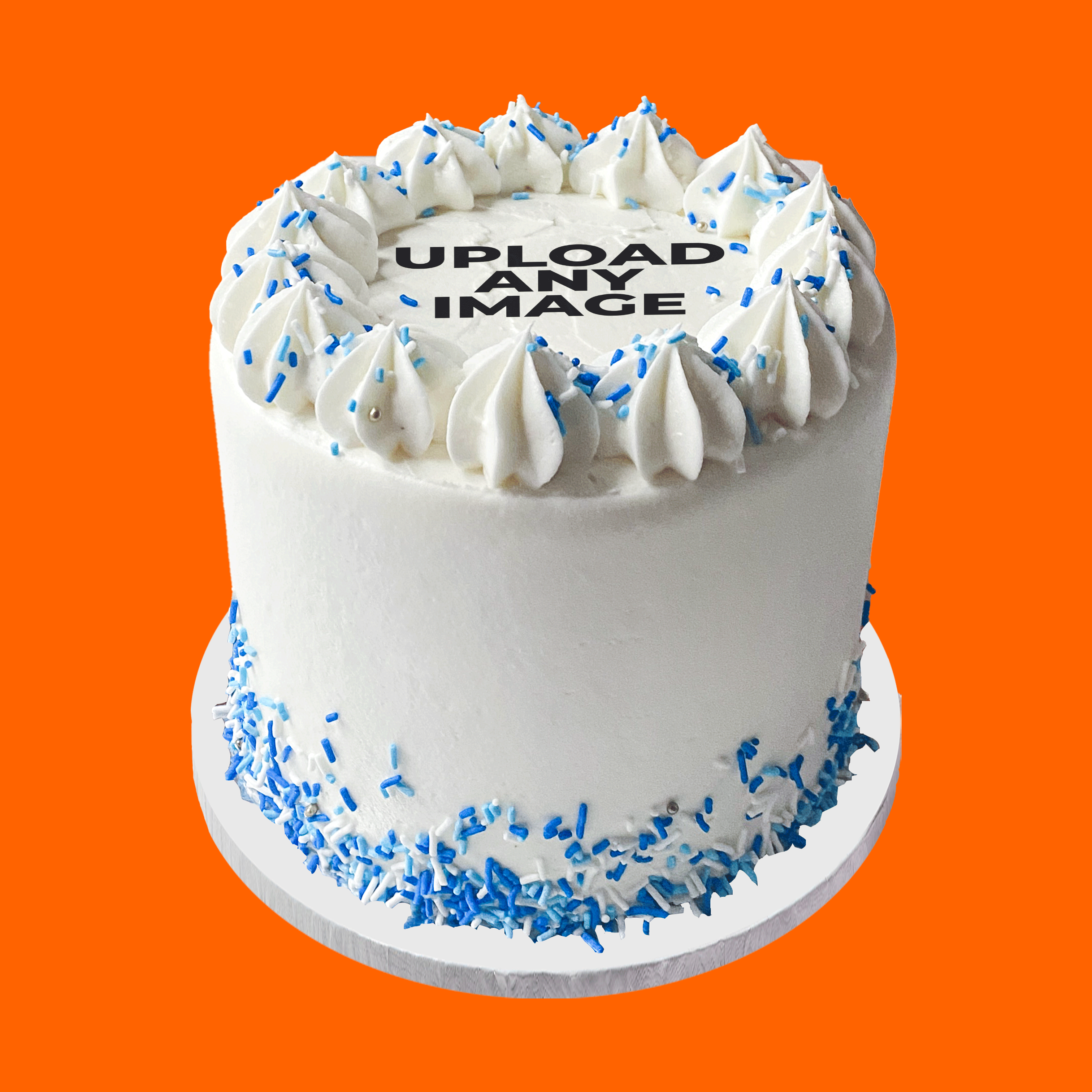 Cake Flavour: Chocolate Cake, Vanilla Buttercream, Blue Sprinkles & Custom Image